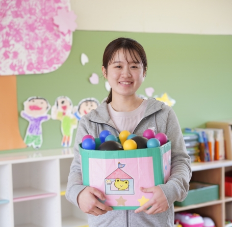 生まれ育った地域で保育士や幼稚園教諭として働きたいと思い、公務員採用試験に挑戦し、土岐市の職員になりました。今は幼稚園で4歳児のクラスを担当しています。はじめは仕事を覚えるので精いっぱいでしたが、最近は自分なりに工夫しながら子どもと関わっています。4歳児の子どもはできることが増えて自信を持つ一方で、できないとわかると「やりたくない!」とすねてしまうことがあります。そんなときは悔しい気持ちを否定せず受け止めるようにしています。気持ちに共感することで、子どもは頑張ろうと前に進みます。こうした心の動きを専門的に学んだのが、心理学のゼミでした。たとえば子どもが友だちを叩いたとき、ただ叱るのではなく「なぜその行動をしてしまったのか」その理由を考えることが大切だと学びました。行動や言動の背景にある気持ちを心理学の視点から学べたことは、子どもはもちろん保護者との関わりを考える上でも役立っています。子どもがいきいきと頑張る姿を間近で見ると、仕事のやりがいを感じます。子どもの「やりたい!」と思う気持ちを大切にして、日々の成長を支えたいと思います。