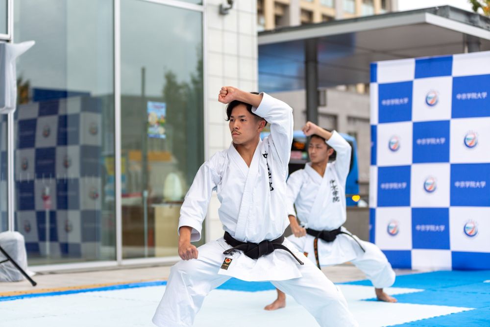 当日は時折雨も降るあいにくの天候となりましたが、多治見市役所駅北庁舎ピロティにステージを設置させていただき、13時よりスタートしました。 冒頭には高木多治見市長から歓迎のご挨拶をいただきました。その後、本学の多治見移転への想いを語るトークセッション、大学、学部紹介、本学空手道部による演舞、11月16日(日)に開催される大学祭の告知と進みました。