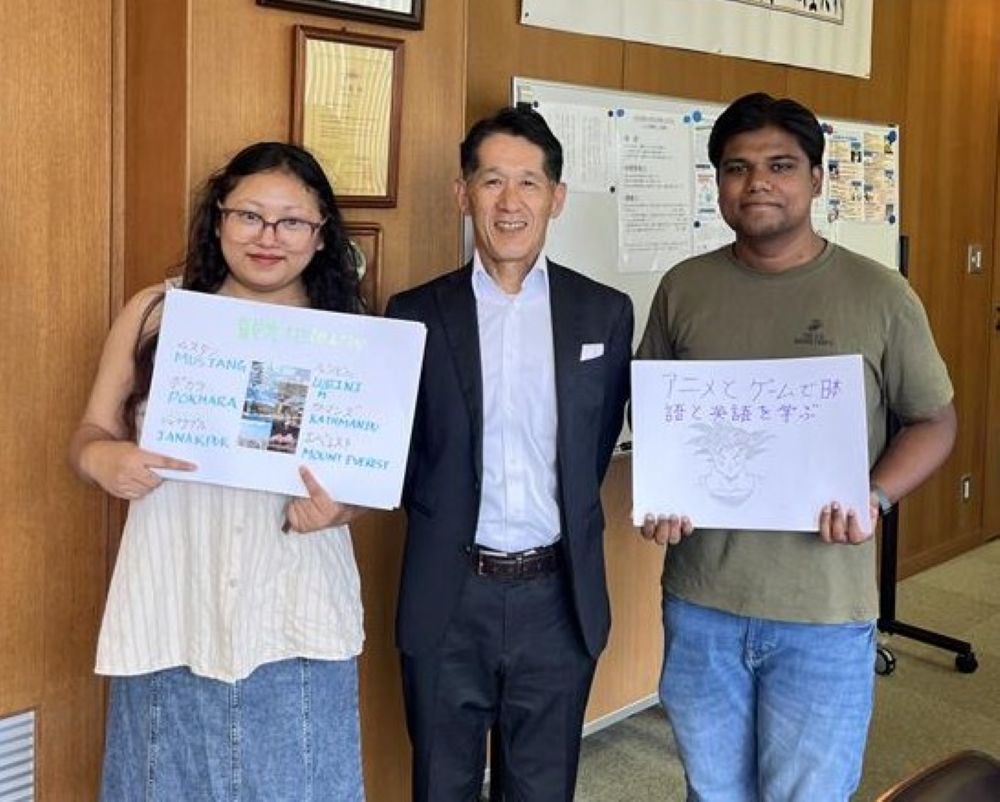 プレゼンテーションで最も伝えたかったのは「ネパールにはたくさんの良い場所があります。特に私の大好きな場所でブッダの生まれたルンビニ、綺麗な山や川があり、美味しいリンゴでも有名なムスタンを知って欲しいです」(チョイサン)「最初は英語の勉強のために日本のアニメを見ていましたが、その後、アニメが世界で有名になって、英語字幕付きで日本のアニメを見続けていたら、英語も日本語も簡単に覚えることができました。日本人の学生も英語を覚える時、是非やってみて欲しい」(シュボ)と二人とも流暢な日本語で説明してくれました。4月からの大学生活を振り返ってもらうと「今一番したいことは旅行です。日曜日は朝から夜までバイトをやっているので、月曜の朝は起きるのが大変です。大学ではもっと日本人の友達を作りたいです」(チョイサン)「ドローンに興味がありもっと学びたい。大学で一人ぼっちなことには慣れているけど、少し残念です」(シュボ)と日本人の学生と関わりが少ないことが気になっているようでした。
