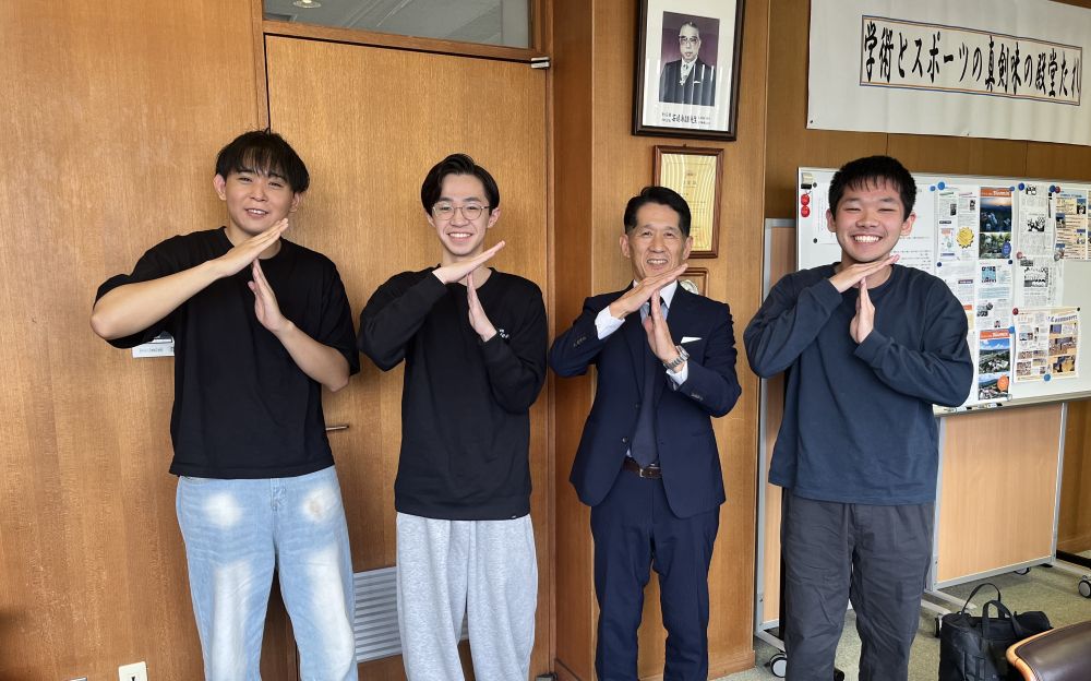 秋風の心地よさに思わず深呼吸してしまうような日が続いておりますが、皆さんいかがお過ごしでしょうか。さて今回のお客様は、名古屋市で開催された「GARAGE CHALLENGE」に参加し、見事第2位に輝いたイベントプロデュース同好会の松下航さん(経営3)、佐藤響さん、松井希伊智さん(経営2)です。このチャレンジは、「社会に対する疑問や課題、個人の想いや気づいた価値を3カ月でカタチにしませんか?」を合言葉に、起業を目指す人や何かをやりたいと思っている人が集まり、企業代表、管理職、社団法人理事等のメンターからアドバイスを受けながら、自ら立てた「問い」の答えを導き出し、独自性・社会性・実現性・継続性の観点から審査を行うものです。「今の高卒就職は間違ったやり方だ」をテーマに発表した皆さんに、これまでの経緯や学びとなった点など伺いました。