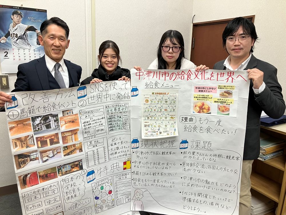 まずテーマ選定の理由を尋ねると、「『中津川市の給食文化を世界へ』というテーマにしました。中津川には観光地の馬籠があり、外国人も多く、日本との食文化の違いを知ってほしいと思ったのがきっかけです」(森)「『一宮市をモーニングでつながる街にする』というテーマにしました。幼い頃から祖母とよくモーニングに行っており、自分にとって身近で、高齢者から子どもまで多くの人が交流する場所になるからです」(山田)と。さらに二人が焦点をあてた食文化の特徴を尋ねると、「『トマト肉じゃが』『鶏肉の夏野菜ソース』など地元食材を使っている点です」(森)「『分厚いトースト』『サラダ・ヨーグルト・茶碗蒸し』など食べきれないぐらいの量があることです」(山田)と話してくれました。