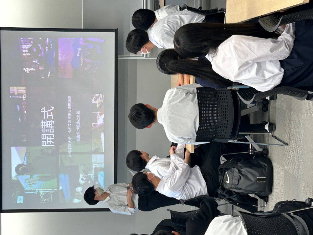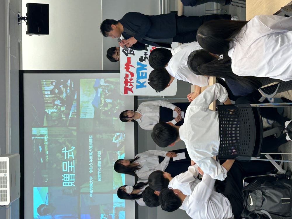 また、経営学のクラスでは開講式の後に、贈呈式が行われました。この贈呈式では、昨年度の受講生が中津川の名産品を使って商品を開発し、令和6年12月1日に六斎市で販売して得た利益を寄付しました。寄付先は、商品開発にご協力いただいた「そらファーム」様と、地域でこども食堂を運営している「スポンサー食堂KENちゃん」様です。