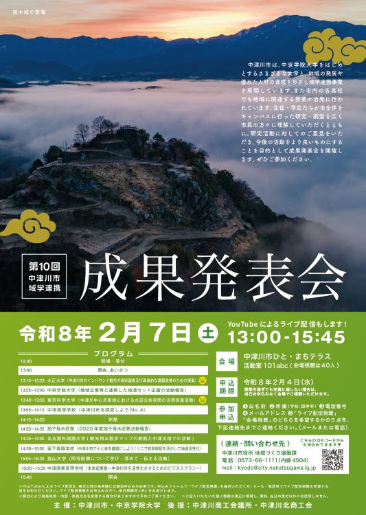 令和8年2月7日(土)に中津川市ひと・まちテラスにて「第10回 域学連携成果発表会」を開催いたします。
