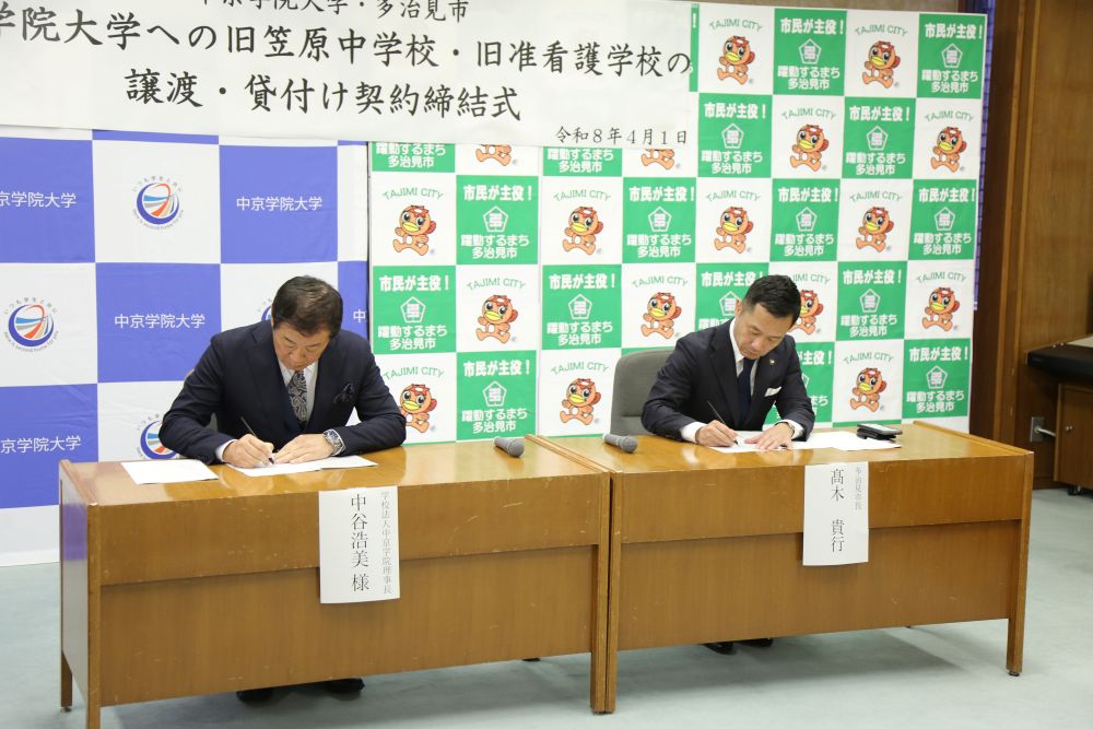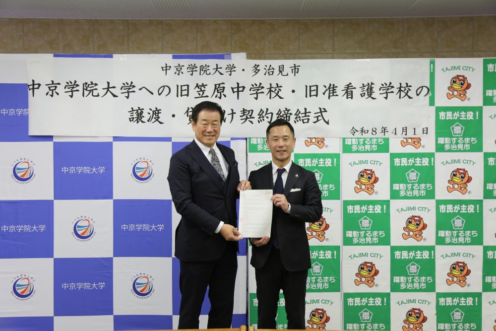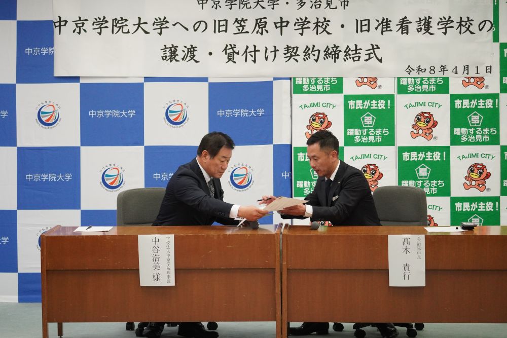 学校法人中京学院は、2026年4月1日、多治見市との間で旧笠原中学校と旧准看護学校の無償譲渡および無償貸付けの契約を無事に締結いたしました。
