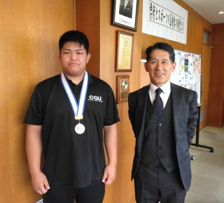 20歳以下の高校生から大学1,2年生までの各地区代表が集まって戦うこの大会。1位は世界大会、2位はアジア大会の出場権を獲得する重要な試合です。残念ながら3位で、出場権の獲得はなりませんでしたが、入賞の要因を尋ねると「同じ重量級の佐々岡先輩から、押す力を強くするための技術的なアドバイスをいただき、それが良かったと思います。相手に力負けせずに押し返せて、点数を積み重ねられました」との事。試合を終えた今の気持ちは「高校時代に負けていた選手にも勝てて、成長を感じられて良かったです」と笑顔で話してくれました。