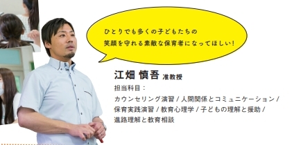 江畑慎吾先生は、中京学院大学、短期大学部:保育科の准教授で、心理学を専門とされ、その面から保育者の卵たちを育成していらっしゃいます。