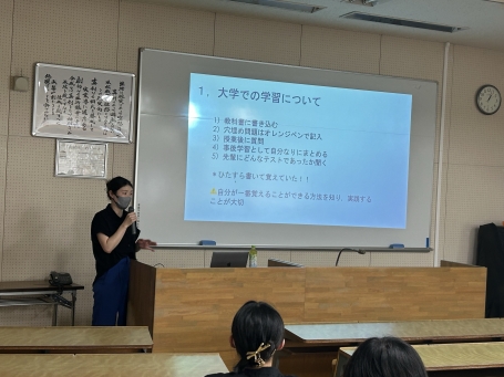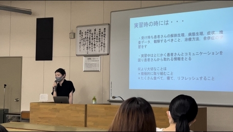 7月10日は、1年生に向け初年次教育の一環として、ホームルーム内で2013年の卒業生で、実習病院でもある土岐市立総合病院の永井雄基さんと、2019年の卒業生で中津川市民病院の水谷千恵さんにお話をしていただきました。
