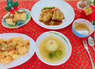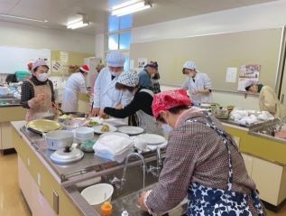 学生たちが日本のクリスマスだけでなく、世界ではクリスマスをどのように過ごし、何を食べているのかについての説明を行い、その後、世界で食べられているクリスマス料理を少しずつ加えながら本日のメニューに仕立てていきました。作って頂いたメニューは「炊飯器パエリア(スペイン)」、「ミートローフ風ロールキャベツ(ミートローフ(アメリカ)・ロールキャベツ(トルコ)」、「付け合わせ:人参のグラッセ(フランス)・アスパラガスのソテー(イタリア)」、「ペコロスのスープ(フランス)」、「クグロフ(フランス)」というメニューを学生たちと一緒に作って頂き、一緒に楽しいひと時を過ごして頂きました。18年間、続いてきた「Let‘s食王」が今回で終わることをとても残念に思って下さり、とても有難かったです。ここでの活動が学生たちの心に残り、この経験が今後に活かされることを願っています。これまでの18年間に「ありがとう」の気持ちを込めて「稲津・スポーツ文化クラブ」の「Let’s食王」にご参加頂きました皆様に、心から感謝申し上げます。そして2024年のクリスマスが皆様にとって素敵なクリスマスでありますように・・・・。 【記載者:田中 恵子】