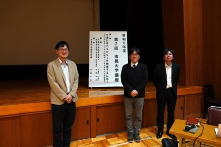 2月1日(土)に中津川市中央公民館(主催)にて令和6年度市民大学講座(第2回)が開催されました。講座のテーマは「中津川市のSDGsを推進するためには?~アジアをフィールドに研究してきた先生たちの提言~」で、経営学部の大須賀元彦先生と短期大学部の富田宏先生が講師を、経営学部の須栗大先生が司会を務めました。